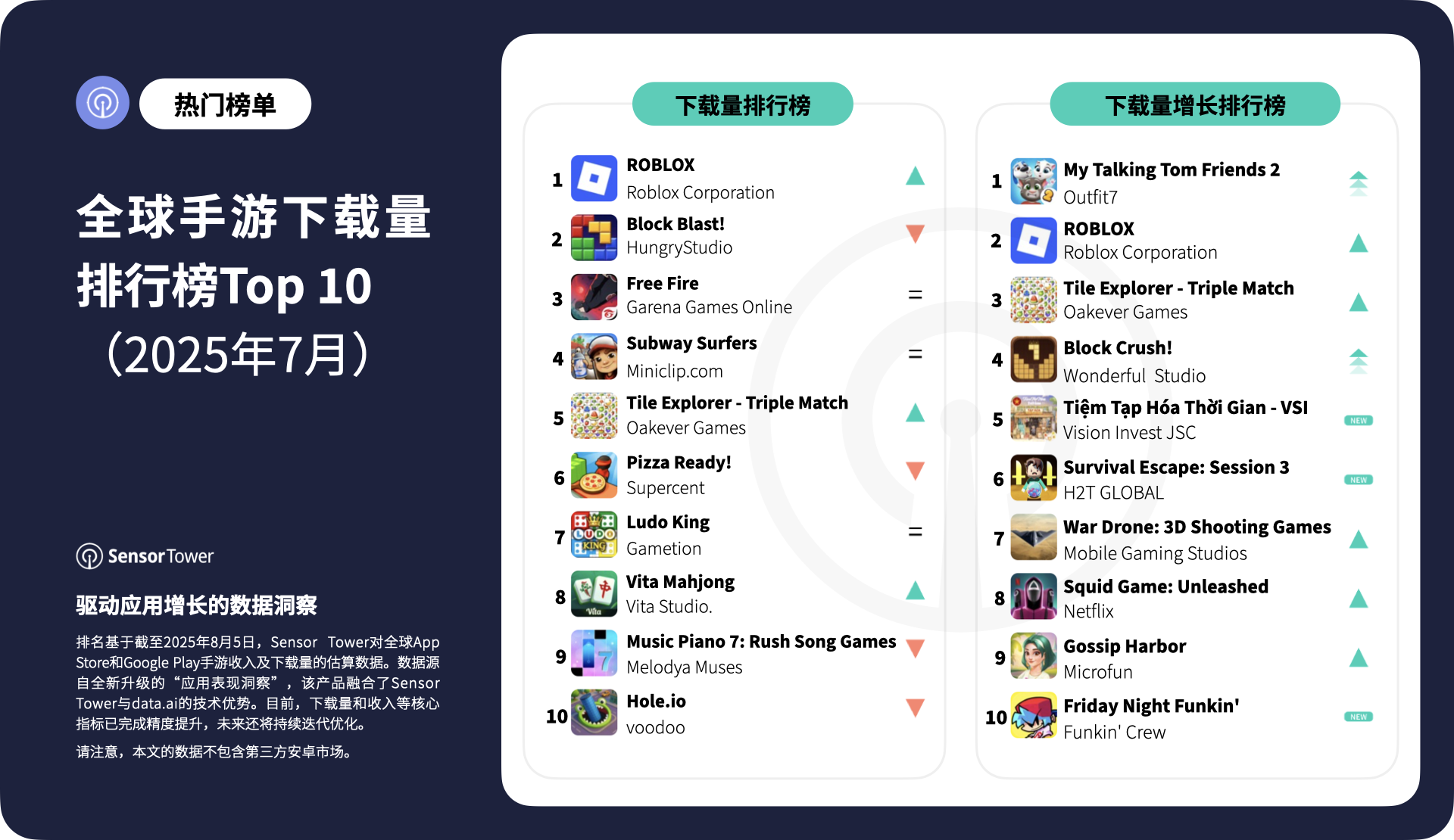 《ROBLOX》重回全球手游下载榜榜首。《Block Blast!》稳居第2,其后分别是《Free Fire》、《Subway Surfers》和《Tile Explorer - Triple Match》,共同跻身前五。