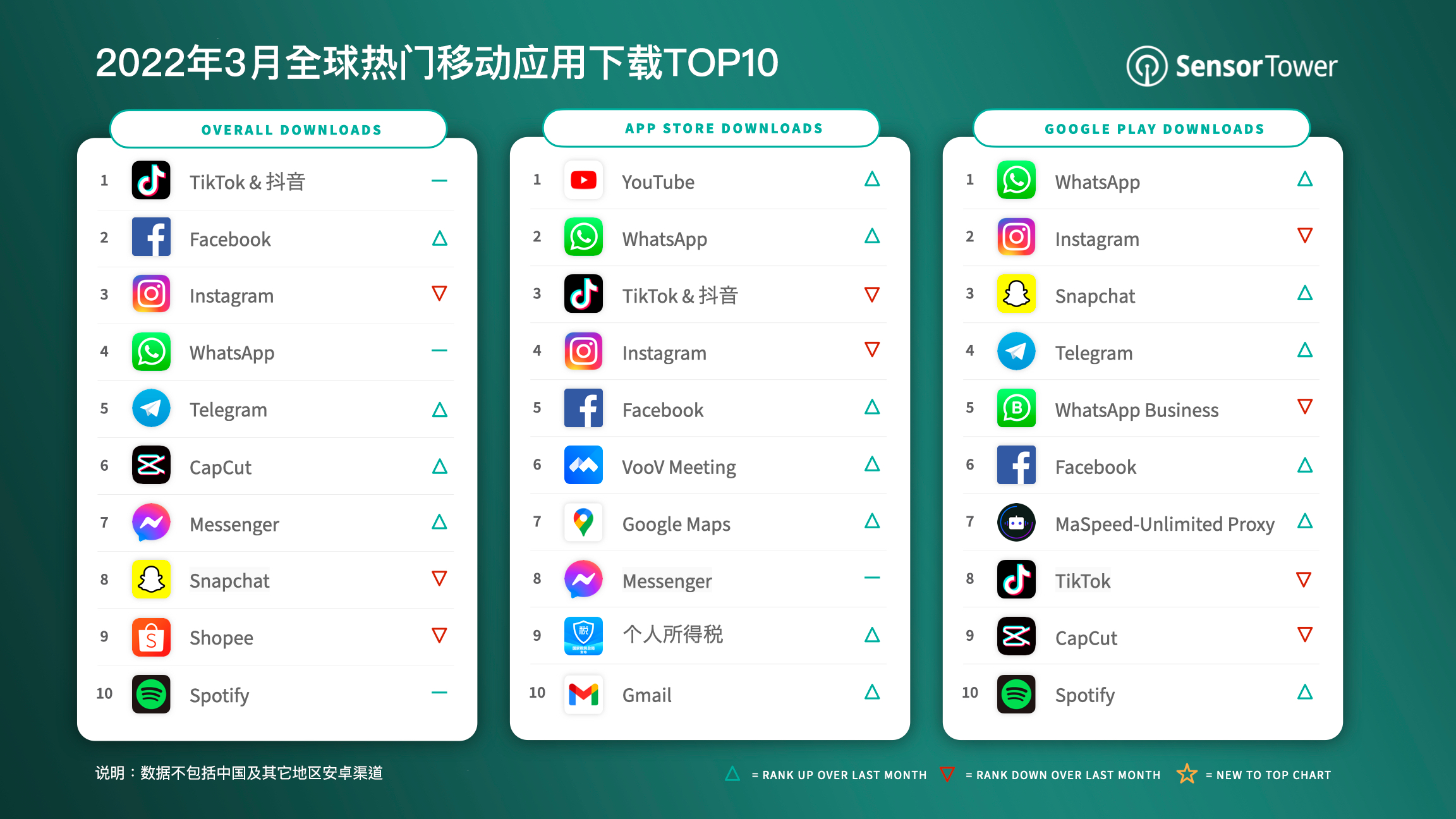 说明:Sensor Tower下载量数据仅统计App Store或Google Play账号首次安装,同一个账号在不同或相同设备的多次安装不重复统计。下载量数据已合并同一个应用的多个版本,如Facebook和Facebook Lite。
