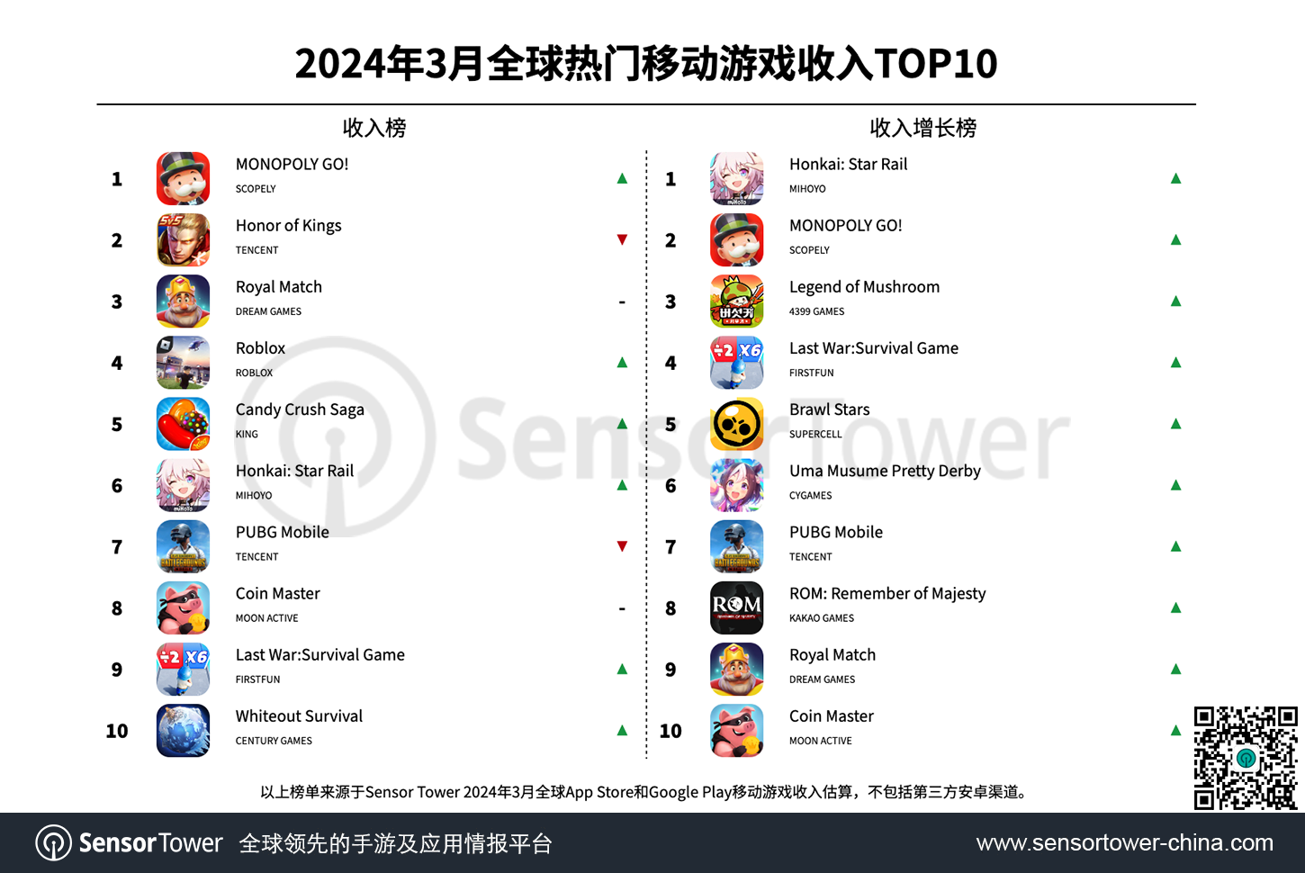 收入榜前五另外三款游戏为Dream Games《Royal Match》、《Roblox》和King《Candy Crush Saga》。