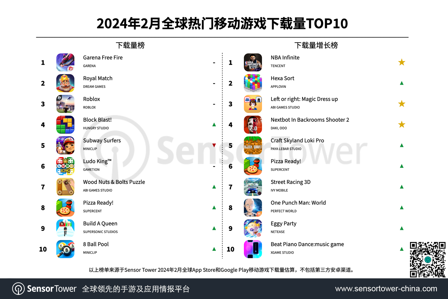 排名前五的另外3款游戏依次为《Roblox》、Hungry Studio《Block Blast!》和Miniclip《Subway Surfers 地铁跑酷》。